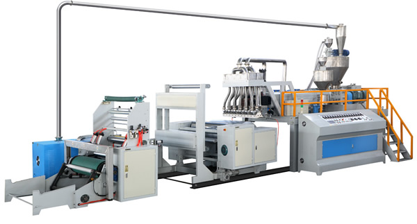The double-layer stretch film unit is suitable for producing low-density polyethylene (LDPE) or linear low-density polyethylene (LLDPE) plastic wrap film. The machine adopts twin screws, and the two feed hoppers use different formulas for the raw materials. The film produced can achieve the effect of sticking on one side. It is widely used for packaging of building materials and hardware accessories.